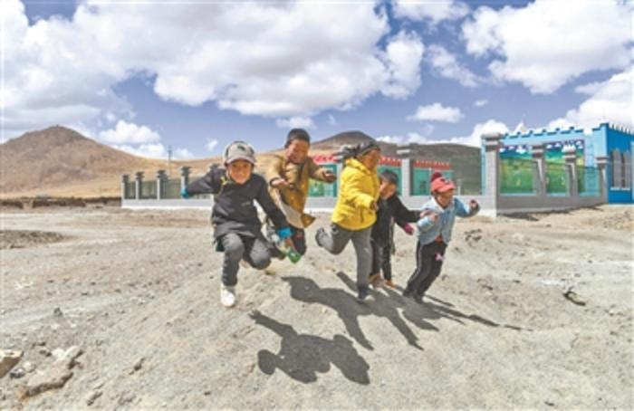 图为在我国海拔最高的行政乡——西藏山南市浪卡子县普玛江塘乡,小朋友们在新建成的幼儿园前玩耍。 新华社记者 晋美多吉 摄