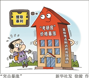 新华社记者调查发现:随着考研时间临近,一些地方宾馆、酒店的“考研房”价格暴涨5倍至10倍之多;有的宾馆、酒店为获暴利,恶意对已预约的消费者毁约;还有的将大厅沙发、值班室按客房价卖出,甚至将不具备安全卫生经营资质的空间高价出售给考生过夜,攫取暴利。 新华社发 徐骏 作