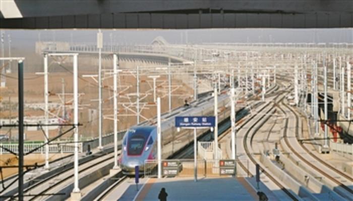 图为用于测试的动车组列车驶离京雄城际铁路雄安站。 新华社记者 牟宇 摄