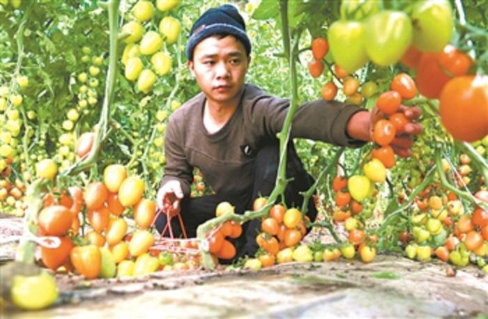 12月27日,在甘肃省敦煌市转渠口镇雷家墩村生态农业园区,农民在日光温室里采摘圣女果。