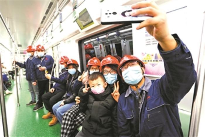 12月28日,中铁电气化局铁路工程公司的地铁建设者谢新宝(右一)和妻子王二蓉带着儿子在西安地铁5号线列车上拍照打卡,记录下这条地铁开通的幸福时刻。当日上午9时30分,西安地铁5号线、6号线一期与9号线同步开通运营,至此西安轨道交通运营总里程达到215公里。