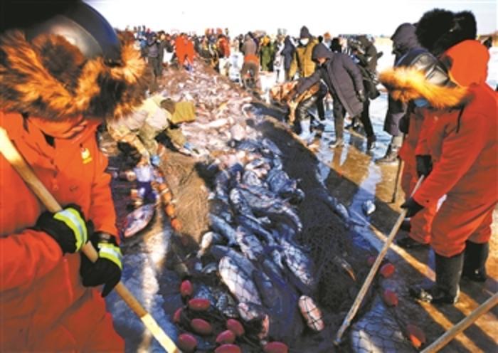 12月27日,2020年镇赉哈尔淖冬捕节开幕。八方游客齐聚,共赏冰上渔猎,见证冰湖腾鱼盛景。这是吉林省2020年冬捕第一网,喜获红网,一网捕鱼超15万公斤。