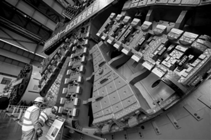 12月26日,中铁十一局两名职工在放置大型盾构机的标牌。当日,在武汉市黄陂区临空产业园中铁十一局武汉重型装备有限公司,两台大型盾构机正式下线,标志着该公司正式落成投产。该公司是中国铁建华中盾构基地。盾构基地占地面积100亩,分两期进行规划建设。已投产的一期占地约45亩,设置8个盾构机组装调试工位,年维修再制造能力32台次,是目前华中地区规模最大的专业盾构施工综合服务基地。