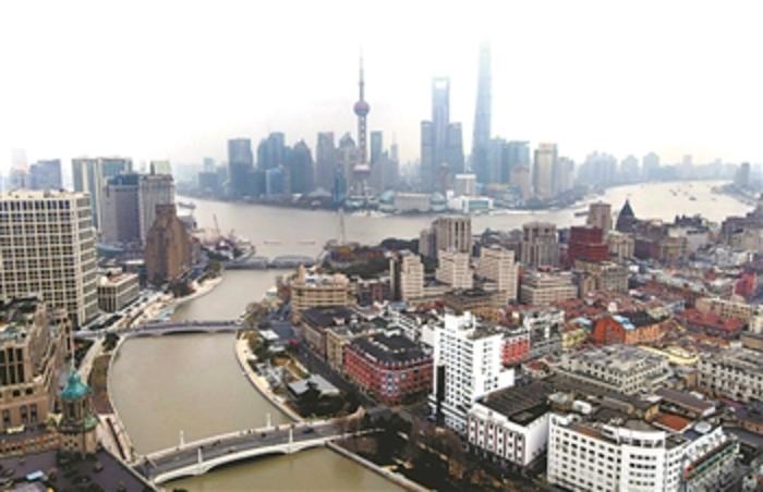 12月29日,从空中俯瞰苏州河(下)与黄浦江的交汇处(无人机照片)。