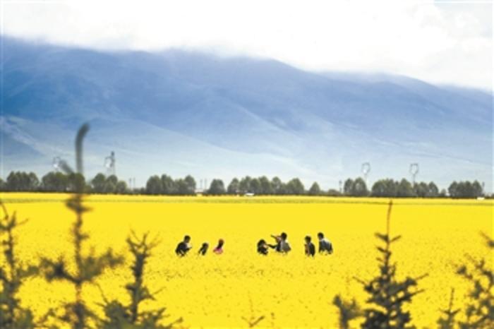 7月22日,游客在青海门源回族自治县的油菜花田中拍照。 青海省地处青藏高原东北部,其自然之美深受游客欢迎。据统计,2020年1月至11月,青海累计接待国内外游客3223.85万人次,旅游总收入281.92亿元,累计带动10.3万贫困人口脱贫致富。
