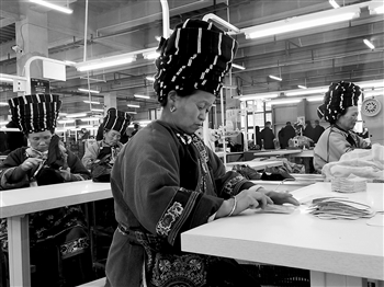 今年以来,以生产箱包和鞋类为主的大型外贸民营企业繁荣企业集团,在安置区建立3个扶贫生产车间,实现搬迁户300多户400余人完成就近就业。目前,扶贫车间员工每人月收入在2000~4000元。 图为扶贫车间内工人们正在生产。