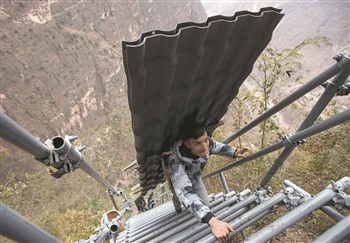 2020年12月23日,某色苏不惹背着修民宿的建材攀爬钢梯。当天,悬崖村27岁的小伙子某色苏不惹和村里五个年轻人早早就开始了工作,他们把盖房用的塑钢瓦捆绑固定,准备通过钢梯背到悬崖村里,这些材料是准备盖民宿用的。