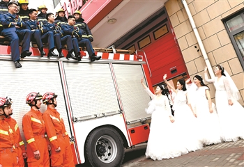 1月4日,参加集体婚礼的消防员与爱人一起拍摄婚纱照。当日,上海市长宁区消防救援支队为2020年因抗击疫情而推迟婚礼的4对新人举办隆重而又简朴的“情定火焰蓝”集体婚礼。在战友们的见证下,新人们许下“携手余生”的诺言。 新华社记者 陈飞 摄