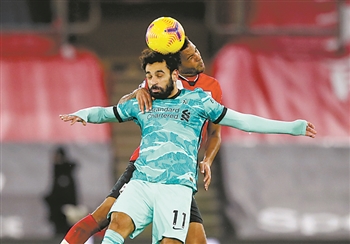 1月4日,利物浦队球员萨拉赫(前)与南安普敦队球员伯特兰争顶。当日,在2020-2021赛季英格兰足球超级联赛第17轮比赛中,利物浦队客场以0比1负于南安普敦队。 新华社/美联