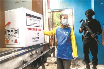 1月4日,在印度尼西亚东爪哇省泗水市,工作人员搬运新冠疫苗。自1月4日起,印尼卫生部开始向全国34个省级行政区分发由中国科兴公司研制的新冠疫苗。 新华社发 (苏尔亚 摄)