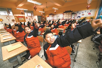 1月6日,成都高新区菁蓉小学六年级三班的学生在做课间操。