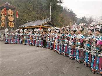 竹山村位于湖南省湘西土家族苗族自治州麻冲乡东北部,曾是一个深度贫困村。近年来,通过大力实施“乡村旅游+特色产业+务工就业+入股分红”,竹山村实现脱贫。图为近日,当地村民身着苗族传统服饰在村口迎接游客。