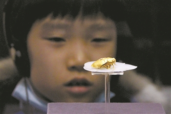 南博镇院之宝“金枝玉叶”,一只神形毕肖的金蝉于玉叶上,极尽工巧和自然雅趣,吸引诸多市民游客驻足观看。