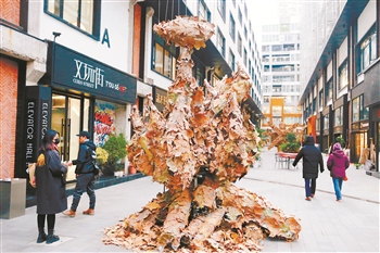 近日,秋叶雕塑亮相上海街头。艺术家借助秋天枯黄树叶在徐汇区画家街设计了《生命之火》等多个创意装置设计作品。