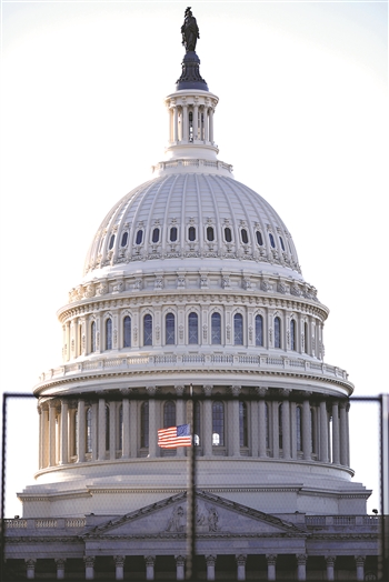 这是1月9日在美国首都华盛顿透过隔离围栏拍摄的国会大厦。美国司法部8日起诉15名冲击国会大厦的示威者,并公布了其中13人的姓名及他们所面临的指控等详细信息。