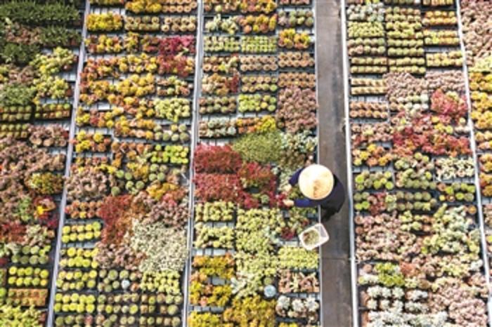 1月12日,工人在浙江平湖农业经济开发区的蓝城现代植物工厂护理观赏植物。