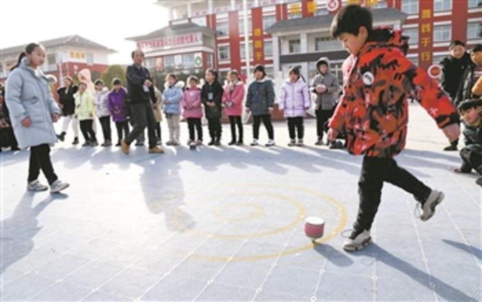 1月11日,河南省济源市梨林镇中心小学的学生在校园进行足螺比赛。