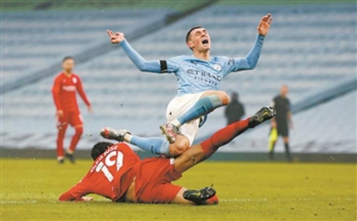 1月10日,曼城队球员福登(上)与伯明翰队球员圣何塞拼抢。当日,在2020-2021赛季英格兰足总杯第三轮比赛中,曼城队主场以3比0战胜伯明翰队。新华社/路透