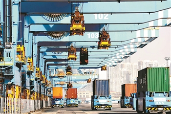 1月12日,在位于山东自贸区青岛片区的山东港口集团青岛港全自动化码头,自动导引车载运着集装箱来回穿梭。 截至2020年12月,山东港口货物吞吐量突破14亿吨、集装箱吞吐量突破3000万标箱。新增集装箱航线35条,其中外贸航线18条,集装箱航线总数达到300条。