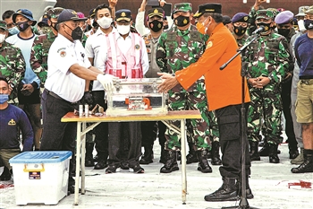 1月12日,在印度尼西亚首都雅加达,印尼国家交通安全委员会主席贾约诺(左)接过“飞行数据记录仪”。