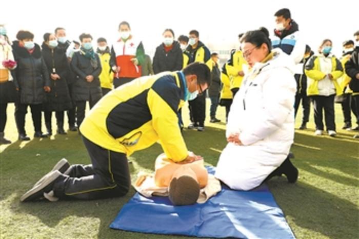 1月13日,安徽省淮北市红十字会救援队队员为师生演示急救包扎。寒假临近,淮北市第十二中学专门邀请当地红十字会救援队队员来到校园,对师生进行心肺复苏、包扎等紧急救护知识培训,提高师生的自救互救意识和能力。本报通讯员 万善朝 摄