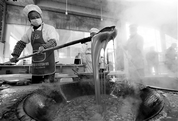 1月13日,工人在贵州省习水县隆兴镇淋滩村一家红糖加工作坊内熬制红糖。