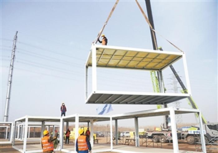 1月15日,工人在石家庄黄庄公寓隔离场所项目工地安装集成房屋。该项目共建设3000间集成房,用于安置新冠肺炎密切接触者和次密切接触者等人员。新华社记者 杨世尧 摄