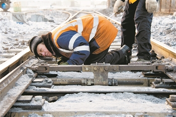 1月11日,漠河道岔维修工队工长杨玉海和工友对漠河站的道岔进行养护作业。