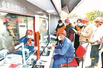 1月14日,在四川省南充市顺庆区金台镇的川渝柑橘现代种业园温室大棚和玻璃大棚项目建设现场,中国工商银行四川南充分行“流动汽车银行”巴士开进了工地,举行“暖冬驿站”服务走基层活动,现场为农民工服务和宣传金融知识。 李向雨 摄/人民图片
