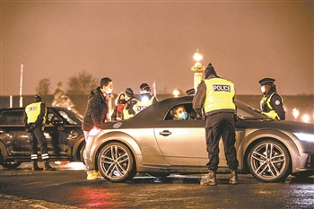 1月16日晚,警察在法国巴黎协和广场检查车辆。鉴于新冠疫情形势依然“不稳定”,从16日开始,法国将把宵禁实施范围扩大至全国,宵禁时间调整为每日18时至次日6时,有效期至少持续15天。新华社发 (奥雷利安·莫里萨尔 摄)
