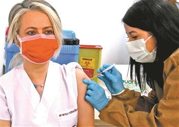 1月15日,在土耳其安卡拉,一名医务人员接种中国科兴公司研发的新冠疫苗。从1月14日开始,土耳其全国医护工作者开始接种来自中国的新冠疫苗,土耳其卫生部统计数据显示,截至15日已有超过60万名医护人员接种新冠疫苗。新华社发 (穆斯塔法·卡亚 摄)