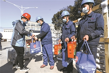 1月18日,在浙江省杭州市余杭区塘栖镇的浙江泰昌实业有限公司内,镇总工会工作人员把大礼包送给留下来过年的外地员工。近期,镇总工会发起了以“关爱职工 情暖留浙”为主题的活动。 新华社记者 徐昱 摄