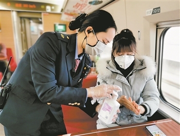 中国铁路郑州局集团公司有10对途经河北的列车,为了加强疫情防控,目前对这些列车的预防性消毒由4小时一次改为2小时一次。图为1月17日,G1560次列车在石家庄站开车后,列车员刘小萌为刚上车的旅客消毒。 陈有会 摄