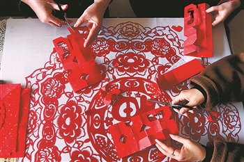 1月21日,中泰街道的党员志愿者跟着剪纸老师杨列平一起学习剪窗花,准备把窗花送到村社百姓家中。