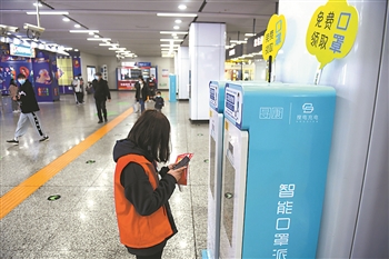 1月24日,在长沙地铁五一广场站,市民在智能口罩派发机上扫码领取口罩。