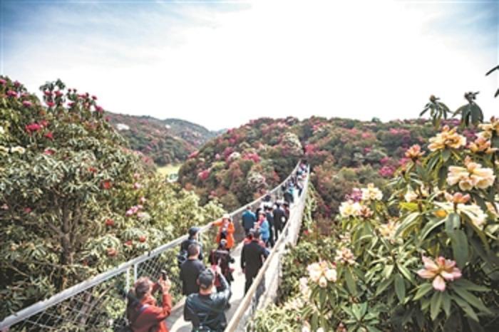 游客在贵州省毕节市百里杜鹃景区游玩(2019年3月28日摄)。