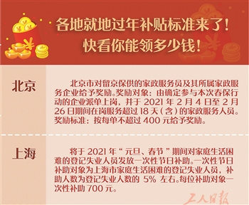 近日,中共中央办公厅、国务院办公厅印发《关于做好人民群众就地过年服务保障工作的通知》。为吸引员工留在当地过年,不少地方已各自出台相应的过年“红包”标准。各地就地过年的补贴标准是多少?《工人日报》记者为您做了梳理。(本报记者 贺少成 曲欣悦)