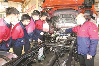 1月28日,山东水利技师学院汽车专业学生在唐骏欧铃汽车制造有限公司生产线上顶岗实习。近年来,该学院通过“工学结合”的校企合作模式,“订单式”培养行业所需的专业技术人才。本报通讯员 翟慎安 李华 摄