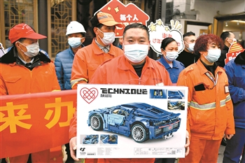 1月28日,来自浙江淳安的保洁员蒋永生(中)获赠一辆玩具赛车。他准备寄给2岁的外孙。近日,浙江杭州下城区长庆街道发起“定制年货大礼包”活动,获得辖区爱心企业、爱心人士10余万元捐赠。活动为就地过年的外来务工人员置办年货和心仪的礼物,并免费通过快递寄给远方的亲人,送上温暖的祝福。新华社记者 黄宗治 摄
