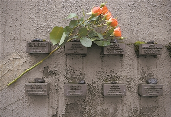 1月27日,德国法兰克福老犹太公墓外的“姓名墙”上摆放着一束鲜花。