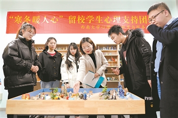 1月27日,在西南大学心理健康教育与服务中心,留校学生在老师的带领下参加“沙盘明心”团辅活动。