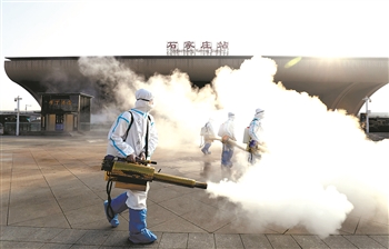 1月31日,消杀队员在石家庄火车站西广场进行消杀作业。近日,河北石家庄市为保障复工复产需求,对重点公共区域外围进行全面消杀。 新华社发(梁子栋 摄)