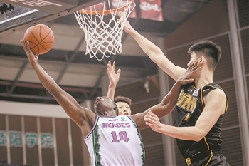 2月1日,山东西王队球员哈德森(左)在比赛中上篮。当日,在2020-2021赛季中国男子篮球职业联赛(CBA)第二阶段第37轮比赛中,山东西王队以121比125不敌浙江广厦控股队。 新华社记者 潘昱龙 摄