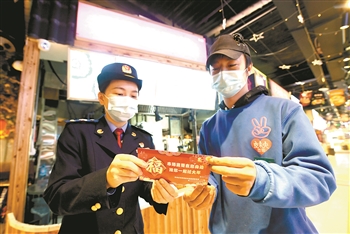 2月4日,石家庄市桥西区市场监督管理局工作人员在桥西区夜未央吃街给商户介绍市场监管服务暖心卡。