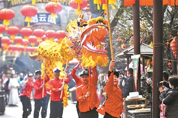 2月4日,游客在杭州宋城景区观看舞龙表演。