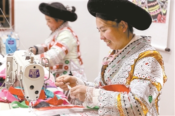 2月3日,苗族妇女在化屋扶贫车间加工服装。