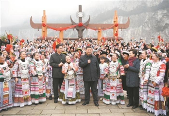村文化广场上,乡亲们正在开展春节民俗活动,打起鼓、吹芦笙,载歌载舞,唱起了欢快的苗家迎客歌。看到总书记来了,大家齐声欢呼“总书记好”。习近平亲切地对乡亲们说,今年我们将迎来全面建成小康社会、实现第一个百年奋斗目标的伟大胜利。中华民族是个大家庭,五十六个民族五十六朵花。全面建成小康社会,一个民族不能落下;全面建设社会主义现代化,一个民族也不能落下。脱贫之后,要接续推进乡村振兴,加快推进农业农村现代化。希望乡亲们继续努力奋斗,把乡村产业发展得更好,把乡村建设得更美。临别时,乡亲们依依不舍簇拥着总书记,齐唱苗家留客歌,深情的歌声在乌江上空久久回荡。