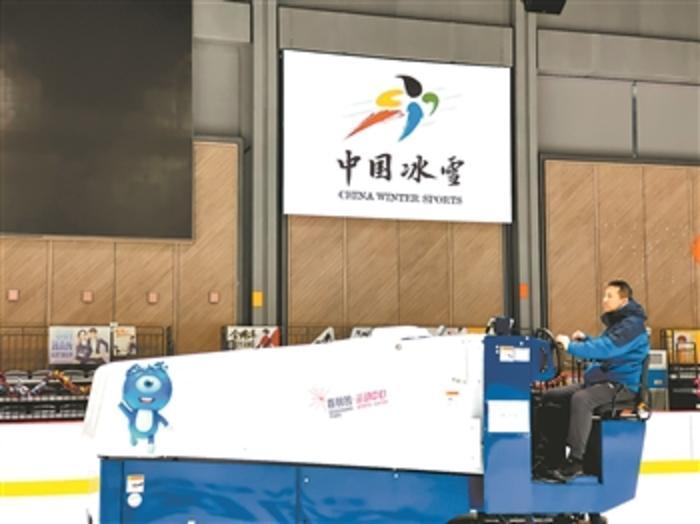 刘博强驾驶扫冰车,在花样滑冰场地进行扫冰作业。本报记者 赖志凯 摄