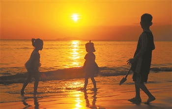 2月3日,海南三亚,小朋友在三亚湾夕阳中玩耍。
