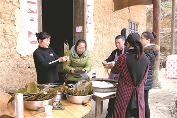 陈美兰(左一)和邻居一起制作客家人的节日美食“箬叶粑粑”。 本报记者 王鑫 摄